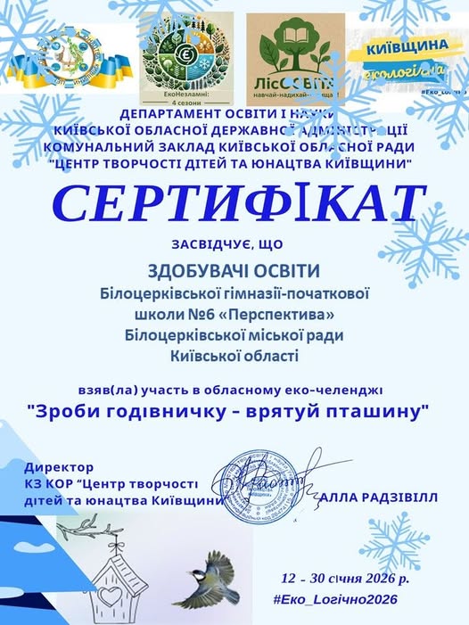 Здобувачі освіти Білоцерківська гімназія‑початкова школа №6 «Перспектива» отримали сертифікат за активну